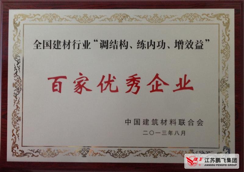 为树立典型,有效遏制经济效益下滑,推进建材行业调整结构和转型升级,弘扬正能量,发挥优秀企业的典型示范作用,促进行业科学发展,中国建材联合会与各省市地方建材行业协会联手开展推荐表彰“调结构、练内功、增效益”百家优秀企业评比表彰活动。江苏鹏飞集团强抓市场机遇,坚持科学发展之路,创新经营模式,被授予“调结构、练内功、增效益”百家优秀企业荣誉称号。