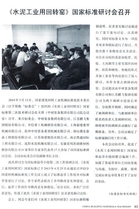 2014年3月12日,国家建筑材料工业机械标准化技术委员会组织的国家标准第二次技术研讨会在天津召开。江苏鹏飞集团股份有限公司等11家单位专家及代表共17人参加了该国家标准研讨会议。