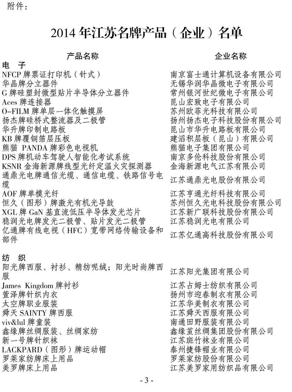 日前,江苏省名牌战略推进委员会公布了2014年江苏省名牌产品名单,“
