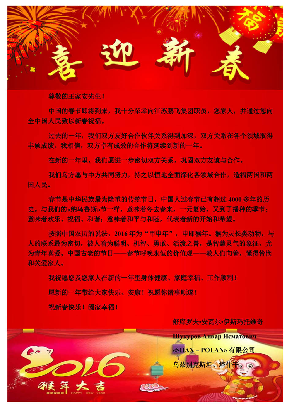 乌兹别克斯坦《SHAX-POLAN》有限公司给我公司发来新春贺电