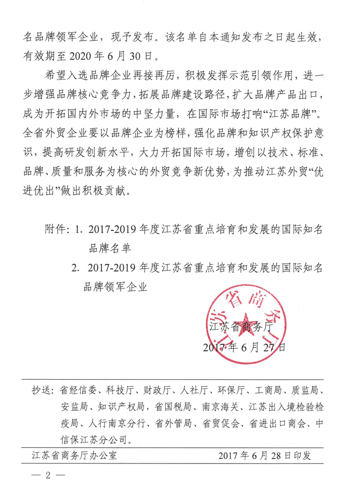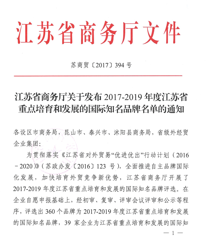 近日,省商务厅公布“2017-2019年度江苏省重点培育和发展的国际知名品牌”名单,经过层层评比,江苏鹏飞集团荣膺在列。
