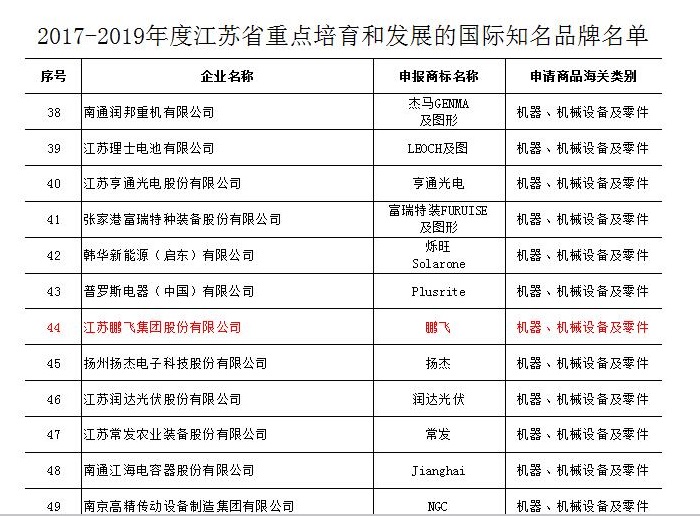 “鹏飞”入选江苏省重点培育国际知名品牌名单