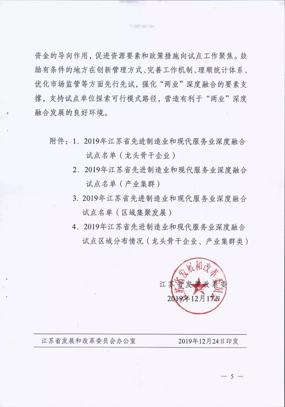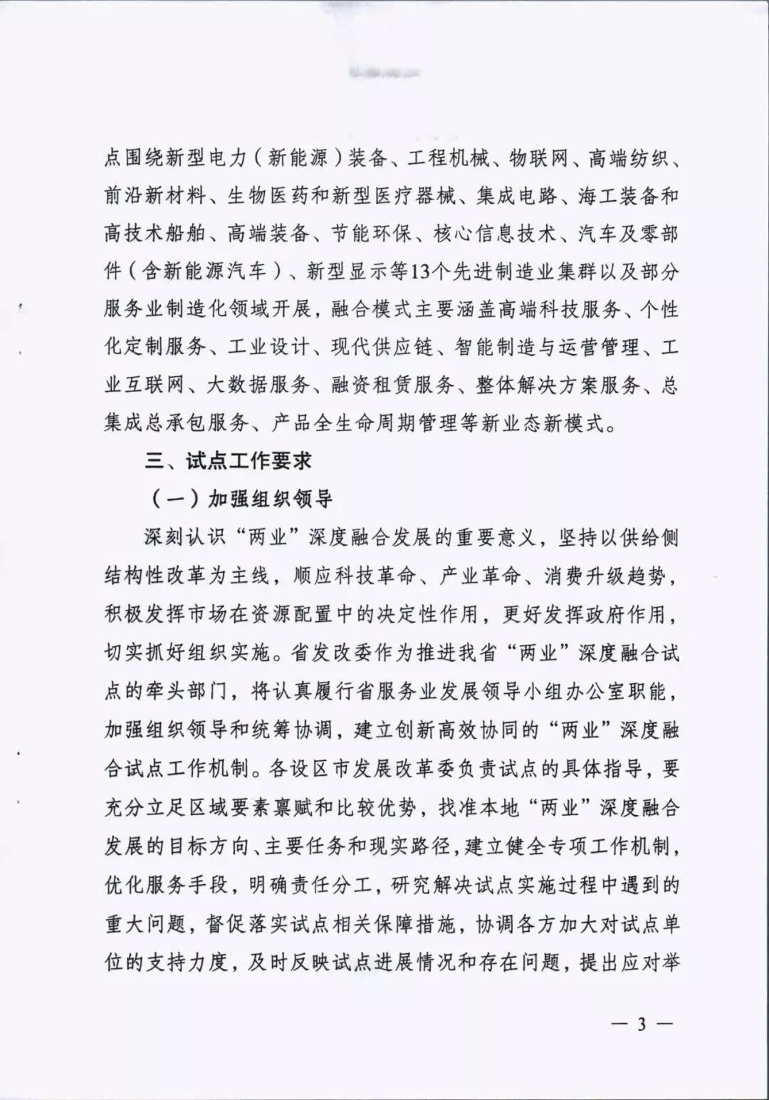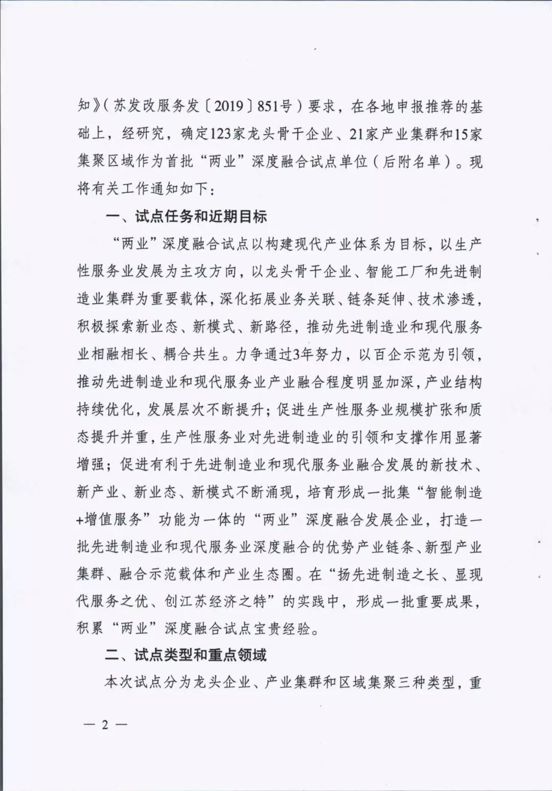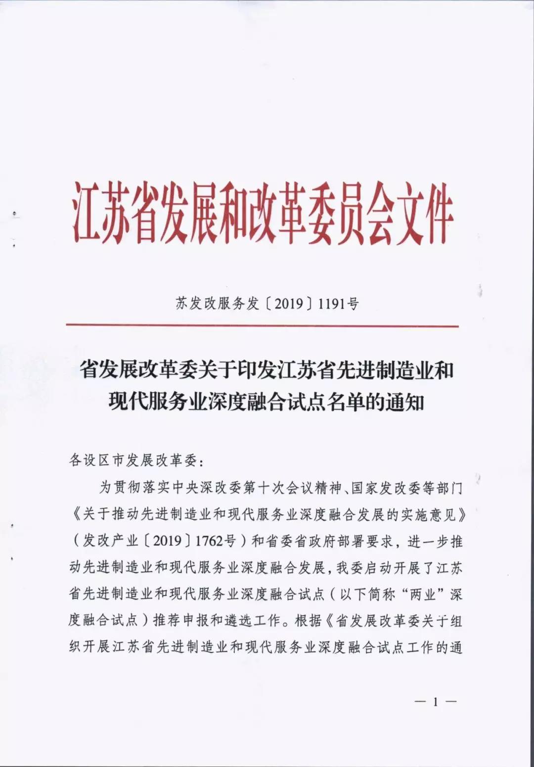 为贯彻落实中央深改委第十次会议精神、国家发改委等部门《关于推动先进制造业和现代服务业深度融合发展的实施意见》(发改产业〔2019〕1762号)和省委省政府部署要求,进一步推动先进制造业和现代服务业深度融合发展,我省启动开展了江苏省先进制造业和现代服务业深度融合试点推荐申报和遴选工作。根据《省发展改革委关于组织开展江苏省先进制造业和现代服务业深度融合试点工作的通知》(苏发改服务发〔2019〕851号)要求,在各地申报的基础上研究确定123家龙头骨干企业、21家产业集群和15家集聚区域作为首批“两业”深度融合试点单位。我市江苏鹏飞集团股份有限公司大型成套装备总集成总承包融合试点、鑫缘茧丝绸集团股份有限公司茧丝绸全产业链产品生命周期管理融合试点、中国天楹股份有限公司智慧城市环境管理系统应用总集成总承包融合试点共三家企业入选试点名单。