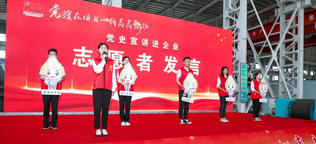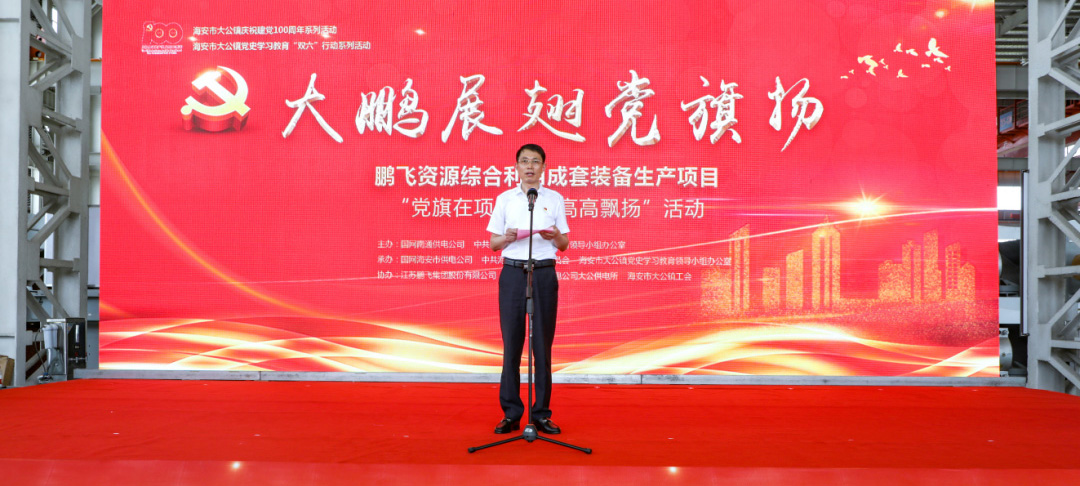 鹏飞资源综合利用成套装备生产项目是南通市第一批“党旗在项目一线高高飘扬”启动项目,由国网南通供电公司挂钩联系。“国网南通供电公司党委把开展党史学习教育作为一项重大政治任务,发挥优势、凸显特色,推动党史学习教育与项目建设、服务企业办实事等重点工作深度融合,做到建强堡垒,党旗飘在项目一线;举旗亮徽,党员冲在项目一线设岗定责,服务下沉项目一线。”国网南通供电公司副总经理李秋实介绍如何国网公司将服务下沉项目一线时说道。