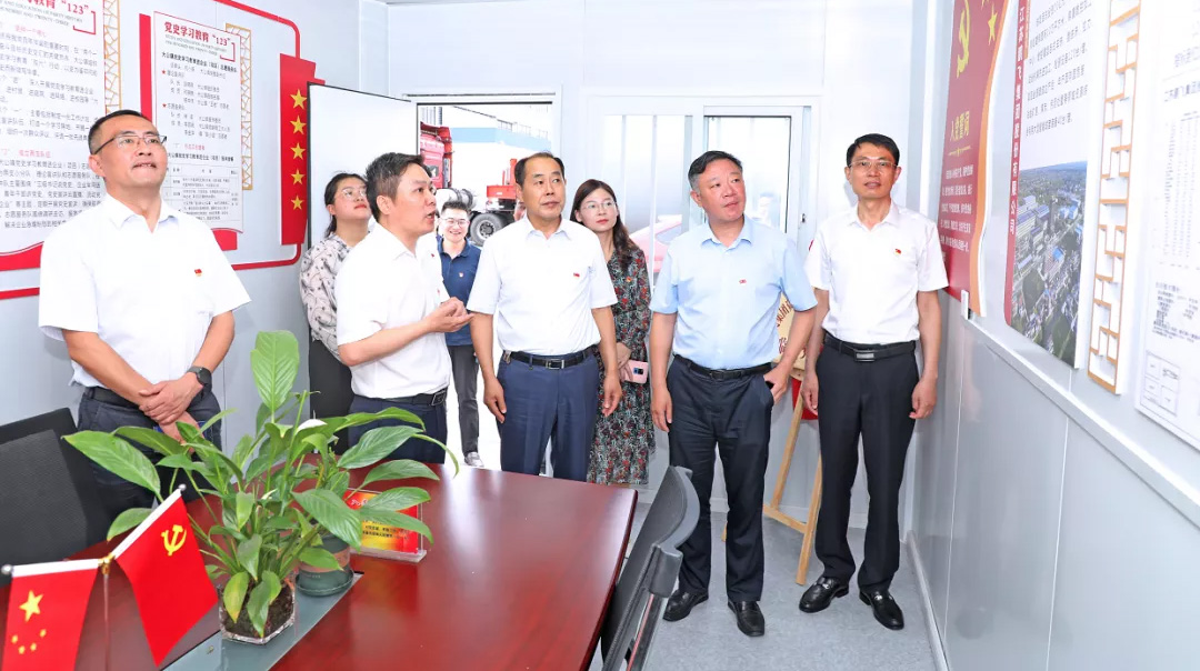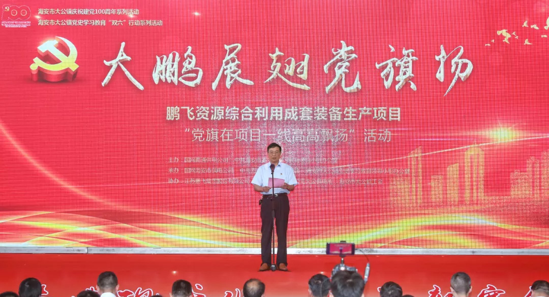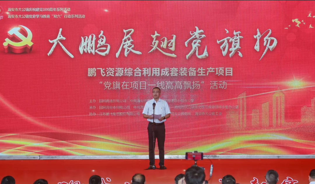 “将企业生产经营与项目建设融入党史学习教育,以党建为引领,让支部建在项目上、党旗飘在阵地上、党员冲在火线上、关爱工人在心上,切实让党旗在项目一线高高飘扬……”6月16日下午,鹏飞资源综合利用成套装备生产项目“党旗在项目一线高高飘扬”活动举行,这也是海安市推动党史学习教育“走深”“走心”“走实”,党员干部在项目一线“建强组织筑堡垒、做优服务强项目、为民办事解难题”的真实写照。
