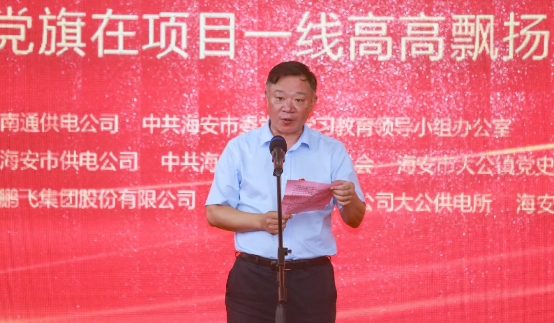 国网南通供电公司副总经理李秋实,海安市委常委、宣传部部长王荣贵,海安市委组织部副部长、“两新”工委书记吴兰,海安市委宣传部常务副部长刘万春,海安市委宣传部副部长、新闻出版局局长陈琳,国网海安市供电公司总经理唐玉婷,海安市发改委党组成员、工信局专职副局长陈皞,鹏飞集团党委书记、董事长王家安,大公镇党委书记金山存,大公镇党委副书记、镇长鲁竞共同启动“党旗在项目一线高高飘扬”活动。