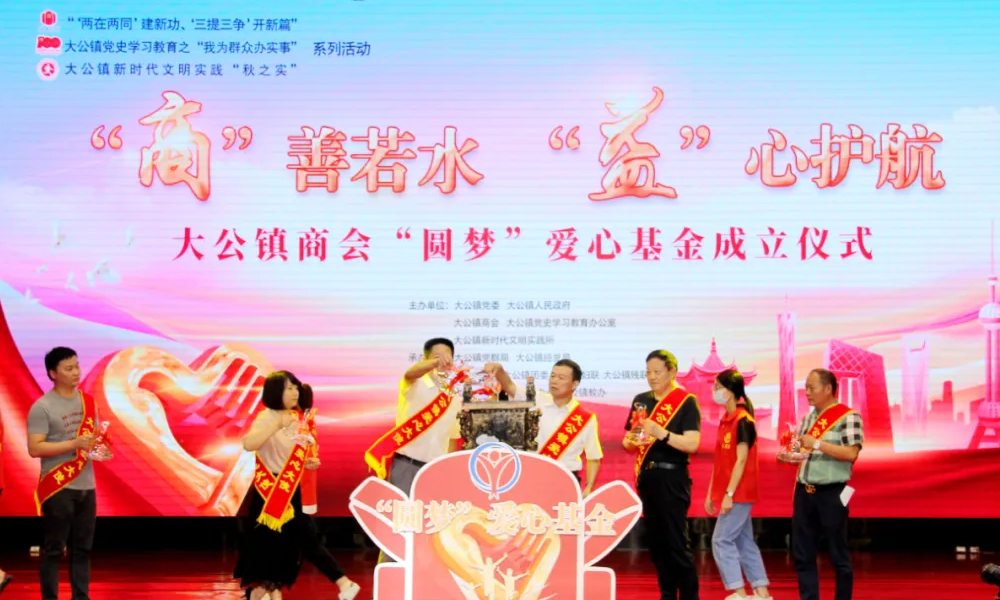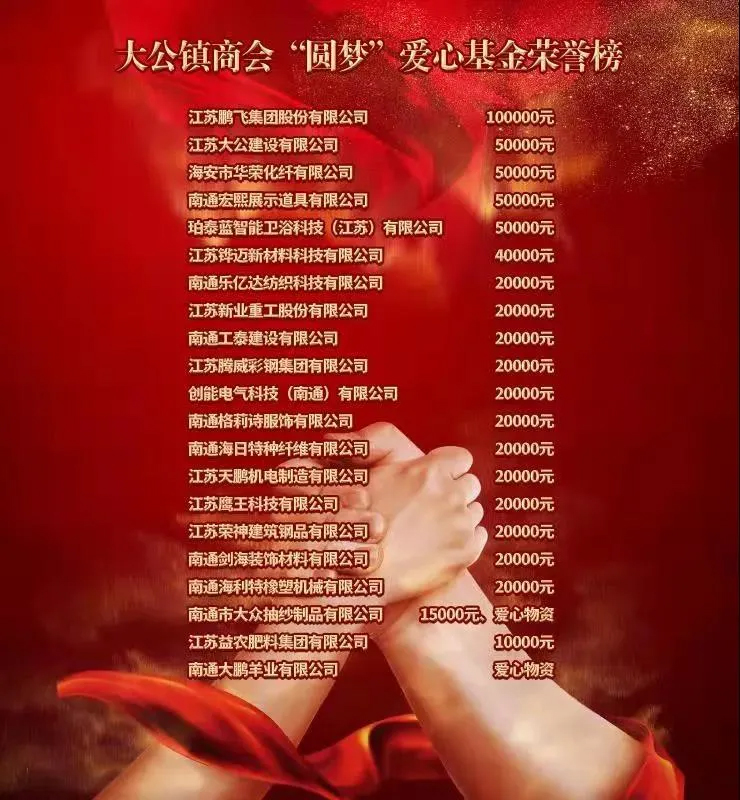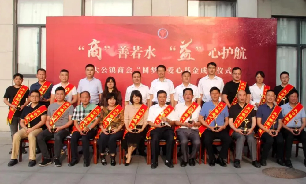 海安市政协副主席、市工商联主席蔡祝平,大公商会会长、鹏飞集团董事长王家安共同为爱心基金揭牌,宣布大公镇商会“圆梦”爱心基金正式成立!前期,大公镇商会21家副会长单位共计筹集60.5万元爱心善款,所募集资金主要用于:帮助困境青少年、开展青少年公益实践等活动。