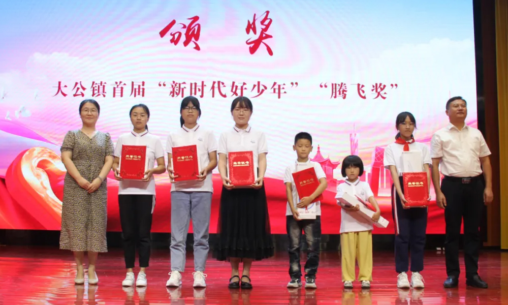 海安市委宣传部未成年人思想道德建设科科长奚海宁、大公镇人大主席王军共同为大公镇首届“新时代好少年”“腾飞奖”获得者颁奖,并送上礼品。