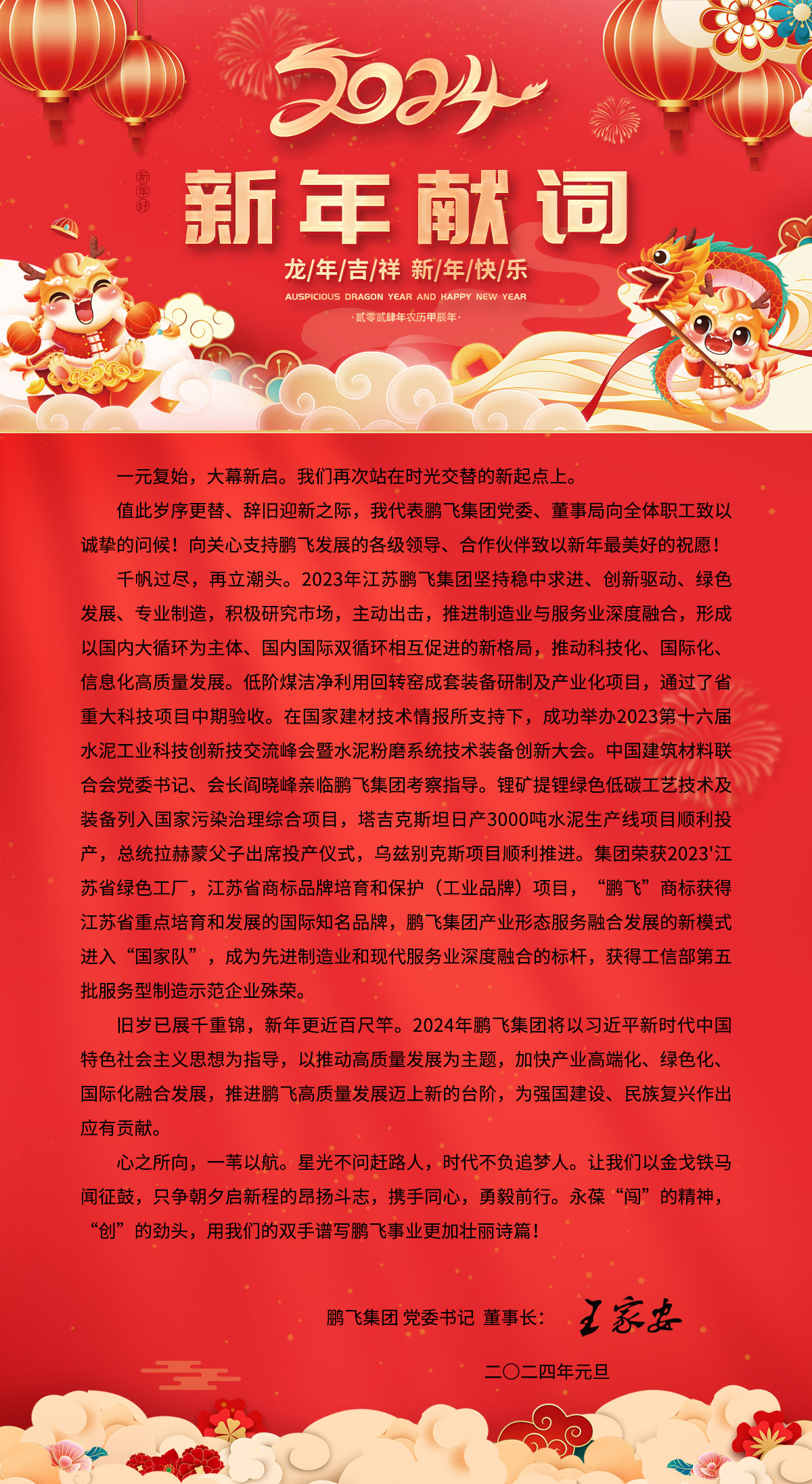 龙年吉祥 新年快乐 江苏鹏飞集团董事长王家安元旦献词