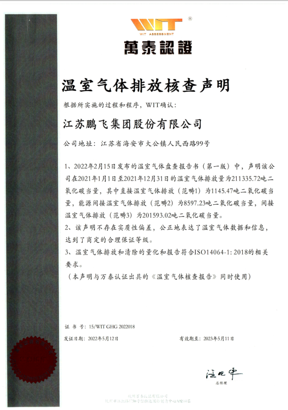 江苏鹏飞集团股份有限公司一直以来坚持绿色采购,绿色生产,绿色物流的原则,积极响应并参与相关方(政府、客户等)节能降排、碳排放报告活动。