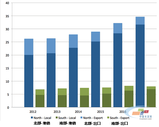 上图展现了巴基斯坦国内水泥行业的现状,巴基斯坦的年度水泥消费量从2012年的3310万吨增长到了2017年的4280万吨,增长幅度在30%左右,其中五分之四的水泥消费集中在巴基斯坦的北部地区。与此同时,更重要的是,巴基斯坦的出口水泥从2013年的830万吨降低到了2017年的420万吨。造成这一现象的主要原因是阿富汗市场的下跌,以及水性熟料出口量的减少。考虑到南方市场的出口水泥比例较高,尽管水泥总消费量在增长,但是出口量的减少对南方可能会造成更大的打击。2018年到目前为止,类似的趋势依然存在,唯一有所改变的是南方熟料出口量的在今年有反弹的迹象。