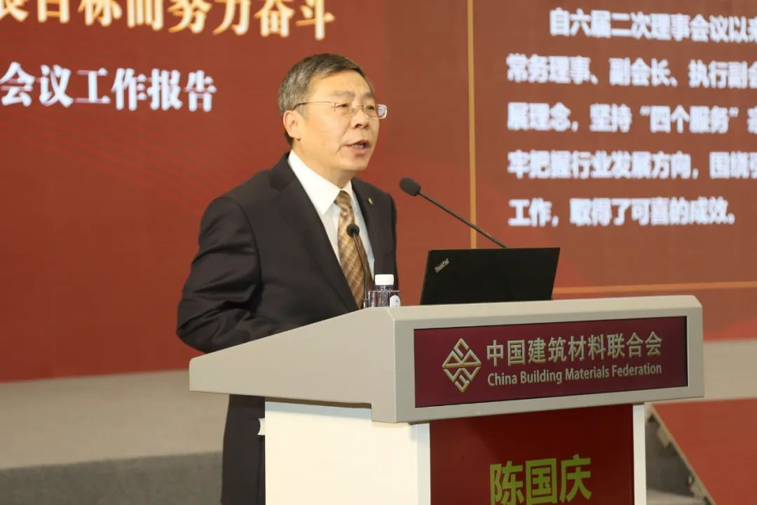 受会长阎晓峰委托,陈国庆代表中国建筑材料联合会六届理事会作题为《坚持绿色低碳安全高质量发展 坚持“四个服务”工作定位 为实现“宜业尚品、造福人类”行业发展目标而努力奋斗》的工作报告。报告回顾了联合会近一年来的工作情况,分析了面临的形势任务,提出了下一步工作思路举措。