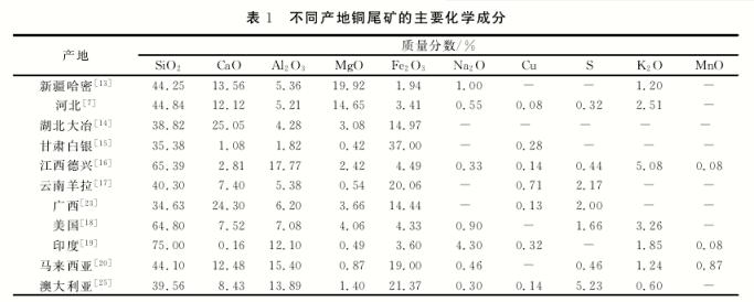 铜尾矿的化学组成非常复杂,不同产地的铜尾矿之间可比较性差,这是铜矿石成矿地质、矿石开采方法、选矿工艺以及铜尾矿堆存方式等差异所致。组成铜尾矿的主要元素有 Mg、Al、Si、S、Ca、Fe、Cu 等,且 伴 有 Mn、Ti、Zn、Sr等 微 量 元素。不同产地铜尾矿的主要化学成分见表1。