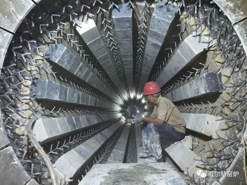 窑体砌筑根据耐材结构形式及耐材运输条件,计划施工顺序如下:从窑头向窑尾砌筑,镁铝尖晶石-高铝砖-预制块焊接-粘土砖-窑两头浇注料。窑体砌筑前必须试车完毕,运转正常并有制动装置,以防窑体因耐火材料的偏重而发生回转;砌筑需转窑时以最慢的速度运转,砌筑完毕后窑体不准随意转动。