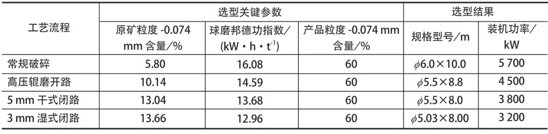 /d、磨矿产品粒度 -0.074 mm 占 60% 情况下,由于不同辊压工艺下原矿粒度 -0.074 mm 含量和球磨机邦德功指数的差异,一段球磨机选型规格存在明显区别。常规流程需 1 台