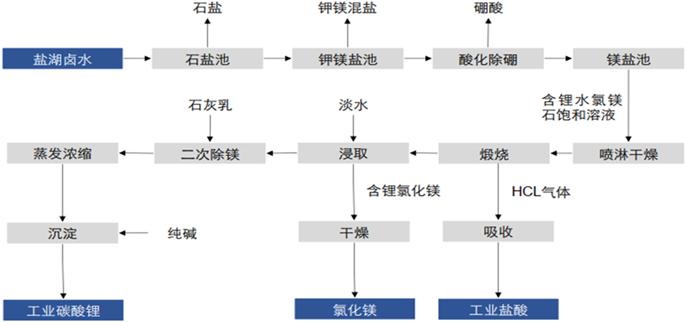 (五)煅烧法 煅烧浸取法的部分主要流程与大部分矿石的冶炼方法类似,先将卤水脱硼,蒸发浓缩得到水氯镁石和氯化锂的固体混合物,再进行高温煅烧(450-900℃)、水浸分离氧化镁、纯碱沉淀分离获得碳酸锂。