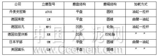 就当前而言,立磨、辊压机、筒辊磨三种料床粉磨设备都可以用于水泥及矿渣微粉的终粉磨。现以立磨为例,世界各知名公司的立磨都有其自主知识产权,磨机内部结构不尽相同、各有千秋。国外立磨结构形式见表2: