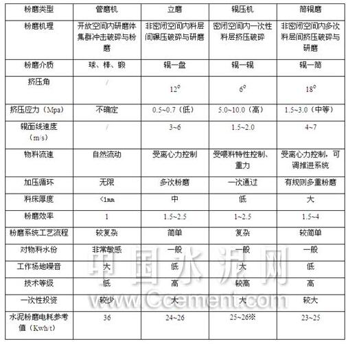 表1 管磨机与立磨、辊压机、筒辊磨粉磨特性对比