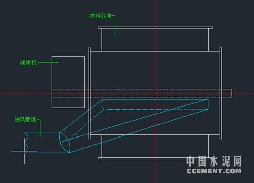 方案三:在锁风阀径向位置安装导风管,无需再引出管路通到磨机。通方案二将窑尾热风通入锁风阀径向导风管中,由此来解决粘料问题。后经过验证,这种方法起到了很好的效果,不论是成本,还是空间结构,以及施工等方面都是最节俭的。(如图二)
