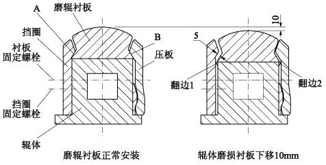 利用库满停机检查,发现有一块磨辊衬板的2条固定螺栓松动,紧固螺栓后用撬杠仍可以撬动衬板。此时分析认为可能是这块衬板与辊体接触面处出现较大磨损、变形,衬板固定不牢固。用塞尺测量接触面A、B处间隙,B处接触面符合要求,A处有5mm间隙。拆开衬板后发现,该衬板下面的辊体磨去10mm左右,辊体在靠挡圈侧及压板侧分别形成宽约5mm及25mm的翻边(见图1中翻边1及翻边2)。其他11块衬板及对应的辊体正常。由上述检查可知,辊体表面的磨损及翻边造成了衬板固定不牢固。