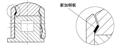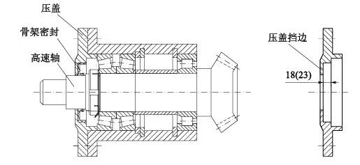 骨架密封厚度15mm,拆下压盖用车床将骨架密封挡边车薄5mm,压盖密封槽深度由18mm加深到23mm(见图4)。此法使得骨架密封在高速轴上的安装位置向外移动5mm,避开高速轴上的沟槽。经此处理,解决了漏油问题,可以正常生产,等到计划检修停机时,再彻底处理高速轴上的沟槽。