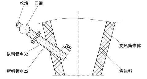 拆下四通及法兰,在Φ32钢管内部套装Φ25钢管,Φ25钢管上端与法兰焊接,下端与原Φ32筒平齐(见图5)。这样处理后,预热器C5B旋风筒负压正常。