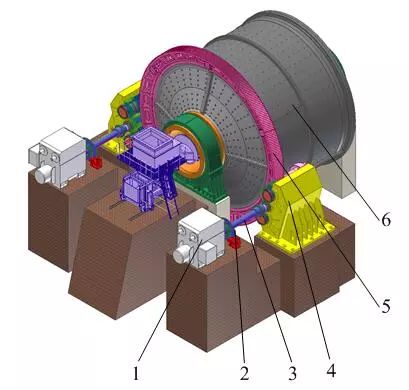 1. 同步电动机 2. 制动器 3. 力矩限制联轴器 4. 多点啮合减速器 5. 齿圈 6. 磨机本体