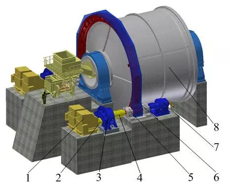 1. 异步电动机 2. 高速联轴器 3. 双输入行星减速器 4. 齿式联轴器 5. 开式齿轮轴组 6. 齿圈 7. 慢速驱动装置 8. 磨机本体
