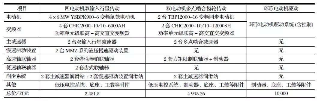 φ12.2 m× 8.8 m 半自磨机为例,对四电动机双输入行星传动、双电动机多点啮合齿轮传动及环形电动机驱动方案进行成本分析,这 3 种传动方案的机械和电控液压系统配置及造价对比如表 2 所列。由表 2 可知,四电动机双输入行星传动造价最低,双电动机多点啮合齿轮传动造价居中,环形电动机驱动方案价格远高于前两种方案。