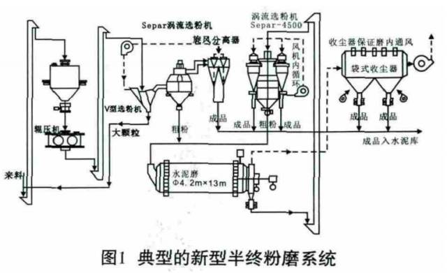 (4)随着水泥粉磨工艺研究的不断进步,对传统联合粉磨系统的不断优化,“大辊压机配小球磨机”的半终粉磨系统脱颖而出。与传统联合粉磨工艺系统相比,辊压机半终粉磨工艺采用一台物料处理能力较大的辊压机和一台喂料、分选能力大的下进风双分离高效选粉机,将V选后的细粉再次进行分选,合格细粉从入磨前的物料中被分选出来并直接送入成品库,中粗粉进入球磨机进行粉磨,大幅度提高了成品产量,改善了球磨机的工况,减少了过粉磨现象的发生。同时V型选粉机与双分离高效选粉机共用一台系统风机,取消了联合粉磨系统中一台循环风机与旋风收尘器及部分管道和输送设备,进而提高了球磨机的综合台时产量,降低了粉磨电耗,减少了设备数量和维修成本。典型的新型半终粉磨系统如图1所示。