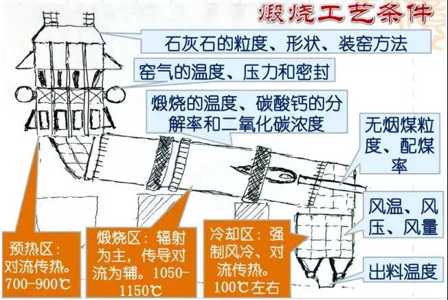 石灰石的煅烧分为三个区段:预热区;煅烧区;冷却区。石灰石煅烧过程大致分4个步骤:开始分解前的膨胀;碳酸钙的分解;石灰石的烧结;石灰的冷缩。此外根据石灰石煅烧工艺,可分为并流煅烧和逆流煅烧。