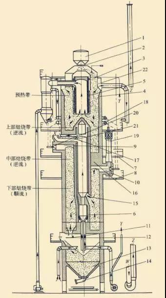 1.料斗;2.料口;3.加料斗;4.外筒;5.上内筒;6.下内筒;7.上烧嘴平台;8.下烧嘴平台;9.上燃烧室;10.下燃烧室;11.液压推杆系统;12.出料台;13.石灰仓;14.振动出料机;15.循环气体入口;16.拱桥;17.冷却梁;18.环形管道;19.喷射器;20.烧嘴;21.循环气体管道;22.环形烟道。