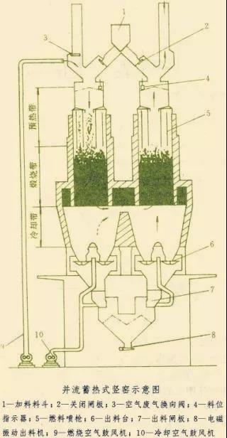 助燃空气及燃料均从煅烧带的上部供入向下流动,煅烧膛的物料也是自上向下流动,两者流向相同,这种物料与燃料产生的热气流流向相同的方式,称为并流煅烧。助燃空气及燃料产生的热气流方向与物料流动方向相反的煅烧过程称为逆流煅烧。从煅烧原理分析,在并流煅烧条件下生产出来的产品活性度高,生烧和过烧较低,产品的质量也容易控制。更适合于生产高品质石灰。