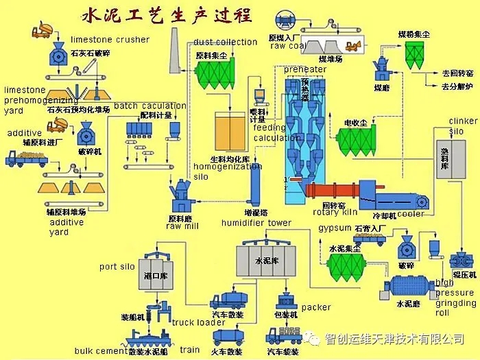 4.生产工艺:硅酸盐水泥生产的大体步骤是:先把几种原材料按适当的比例配合好后在磨机中磨成生料;然后将制得的生料入窑进行煅烧;再把烧好的熟料配以适当的石膏(和混合材料)在磨机中磨成细粉,即得水泥。硅酸盐系水泥的生产概括起来就是“两磨一烧”。生料制备:石灰质原料,粘土质原料与少量校正原料经破碎后,按一定比例配合、磨细,并配合为成分合适,质量均匀的生料熟料煅烧:生料在水泥窑内煅烧至部分熔融所得以硅酸钙为主要成分的硅酸盐水泥熟料水泥粉磨:熟料加适量石膏,有时还加适量混合材料或外加剂共同磨细为水泥生产方法①干法生产 将原料同时烘干并粉磨,或先烘干经粉磨成生料粉后喂入干法窑内煅烧成熟料的方法。但也有将生料粉加入适量水制成生料球,送入立波尔窑内煅烧成熟料的方法,称之为半干法,仍属干法生产之一种。②湿法生产 将原料加水粉磨成生料浆后,喂入湿法窑煅烧成熟料的方法。也有将湿法制备的生料浆脱水后,制成生料块入窑煅烧成熟料的方法,称为半湿法,仍属湿法生产之一种。 干法和湿法生产特点①干法生产特点:干法是将生料粉直接送入窑内煅烧,入窑生料的含水率一般仅1%~2%,省去了烘干生料所需的大量热量。不仅可以制备出质量均匀的生料而且逐步向大型方向发展。现在将悬浮预热和预分解窑统称为新型干法窑,它们成为干法生产今后发展的方向。②湿法生产特点:将生料制成含水32%一36%的料浆,在回转窑内将生料浆烘干并烧成熟料。湿法制备料浆,粉磨能耗较低,约低30%,料浆容易混匀,生料成分稳定,有利于烧出高质量的熟料。但球磨机易磨件的钢材消耗大,熟料出窑温度较低,不宜烧高硅酸率和高铝氧率的熟料。