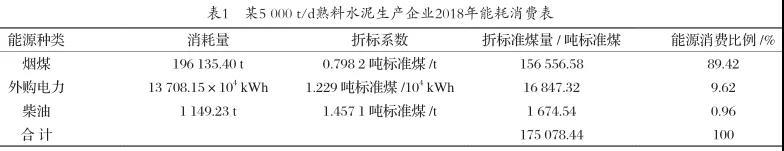 某水泥企业,现有1条5000t/d新型干法水泥回转窑生产线以及2台180t/h水泥磨,具有年产普通硅酸盐水泥熟料150万t和年产硅酸盐水泥160万t的生产能力。主要产品为PO42.5和PS32.5A水泥。主要消耗的能源为烟煤、电力、柴油等。主要生产工序包括石灰石矿山开采、生料制备、熟料煅烧、水泥制成。2018年该企业综合能耗为175078.44吨标准煤。主要能源消费情况如表1所示。